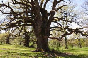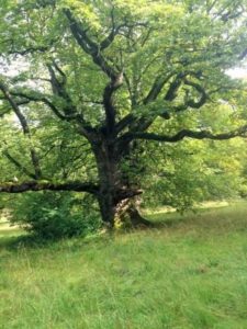 Weiter ging es durch den Eichenwald mit seine bizarren, alten Bäumen. Hier erschien auch die Sonne, die uns nun weiterhin begleitete. In der Mittagsrast gelang es Pierre mit dem vom Regen der vorherigen Nacht feuchten Holz ein bäumiges Feuer zu entfachen,