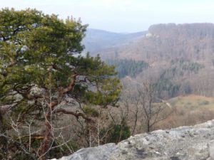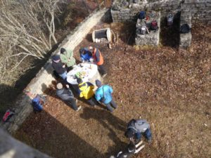 vor wenigen Tagen, am Samstag, waren wir wieder unterwegs. Weder Kälte noch Wolken haben uns abgehalten zu wandern. Und wir wurden belohnt: nach der ersten Rast teilten sich die Wolken und die Sonne erschien. Sogleich war es um gefühlte 5° wärmer. Wir stiegen zuerst über Felder, dann aber lange Zeit im Wald hoch bis zur Ruine Bischofstein. Im Innenhof entfachten wir wie gewohnt das Feuer für unsere Würste und andere