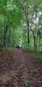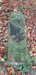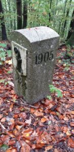 waren fünf Männer, die sich von der schlechten Wetterprognose nicht abhalten liessen. Die Reise mit dem öV bis auf St. Chrischona klappte ohne Verzögerungen. Wir wählten den Weg durch den Chrischona-Campus, sahen Bäume mit originellen Kisten-Ästen, alte Häuser mit altmodischen Namen und einer speziellen Geschichte und gelangten so zur Kirche. Einer der Teilnehmer wusste, wo sich der offene Zugang zur Kirche befand. Wir benutzten die Gelegenheit und stiegen in den Kirchturm hoch, vorbei am Dozentenzimmer und dem Dachboden für die Studenten (Dies geht auf die Anfangszeiten des Chrischona-Seminars zurück, als neben der Kirche keine weiteren Gebäude auf Chrischona standen.) zur Turmstube hoch. Hier hatten wir einen wunderbaren Ausblick ins Ergolztal, Birstal und auf Basel. Nun ging die Wanderung erst richtig los. Die Wetter-App zeigte an, dass es in der nächsten Zeit regnen sollte. Also starteten wir unverzüglich. Die Route 67, der wir folgen wollten, führte auch an der Chrischona vorbei. Zuerst ging es durch den Wald dem Chrischonatal entlang. Auf diesem Weg hatten wir auch zwei kurze Gedankenanstösse: Zum inneren Wachstum brauchen wir ein ehrliches Gegenüber, das uns nicht nur Nettigkeiten entgegenhält, sondern zu uns steht, mit dem wir austauschen können und der uns auch Unangenehmes zu sagen wagt, kurz einen Freund (Es gibt ja Themen, die mit einem Mann leichter zu besprechen sind als mit der Partnerin.). Diese Art der Beziehung im grösseren Stil kam erst mit der vermehrten Freizeit im letzten Jahrhundert gross auf; vorher waren Männerfreundschaften den Gebildeten und Reichen vorbehalten. Die meisten andern Männer waren mit der täglichen Arbeit, und den Verplichtungen der eigenen Familie und Sippe gegenüber schon eingedeckt. Beispiele zu solchen Freundschaften: Jonathan, der Sohn des Königs von Israel und Juda und designierter Nachfolger auf dem Königsthron, und David, der von Gott bestimmte Nachfolger auf dem Königthron; die drei Reformatoren in Basel und Strasbourg, Oekolompad, Capito und Butzer, die sich theologisch und freundschaftlich austauschten und auch besuchten, so dass Wibrandis Rosenblatt beim vorzeitigen Tod ihres Ehegatten zweimal dem nächsten Freund anvertraut wurde; aus dem letzten Jahrhundert ist mir eine Dreier- und später Vierer-Freundschaft bekannt von Männern, die sich in der Arbeit der internationalen evangelischen Studentenarbeit kennengelernt haben, zwei Schweizer, ein Japaner, ein Inder, und die sich jährlich mehrmals trafen um an ihrem inneren Wachstum zu arbeiten. Und dann entdeckten wir die ersten Grenzsteine, zuerst zwar nur Gemeindegrenzsteine und dann der erste Landesgrenzstein. Der Weg folgte von nun diesen Grenzsteinen. Wir stellten uns auch kurz die Situation vor gut 65 Jahren vor: Jetzt ist alles im Wald, links hohe Bäume, rechts hohe Bäume. Damals war der Wald unterbrochen gewesen durch einen breite Schneise und mitten drin zwei Stacheldrahtwalzen, dass ja niemand unabsichtlich die Grenze überschreite. Zusätzlich patrouillierten Soldaten auf beiden Seiten. Endlich sahen wir Inzlingen durch den Wald durchschimmern. Und wieder war ein seltsamer Grenzstein da, der mit einer schwarzen Zeichnung versehen war. Wir standen vor einem Rätsel.