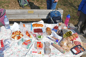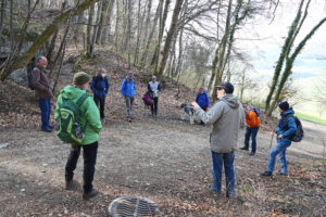 Auf der oberen Weid genossen wir unser Mittagessen. Danach haben wir die nahe Farnsburg besichtigt und weiter unten die Herden des Bauernhofes: Frani und Burgi von weitem, Weideschweine im Freilaufstall und später auf der Weide, Galloway-Rinder und Bisons. Der weitere Weg ging durch den Wald an zwei noch bewirtschafteten Mergelgruben vorbei, begleitet von unterschiedlichen Vogelgesängen, zur Waldegg, wo wir mit einem besinnlichen Moment abschlossen.