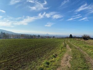 Von Anfang an: In Sissach wartete ich mit meinem Enkel Jamin und kein Mann kam. Auf unserer Reise nach Riehen schlossen sich uns aber immer mehr Männer an und in Riehen wurden wir von weiteren erwartet. So waren wir doch eine gute Schar. Pierre führte uns dann zum ehemaligem Bahnwärterhäuschen der DB, der aktuellen ‚Gedächtnisstätte für Flüchtlinge zur Zeit des 2. Weltkrieges‘. Leider war unsere Zeit sehr knapp, so dass wir nur einen kurzen Einblick in dieses Museum erhielten. Es umfasst Zeugnisse von betroffenen Flüchtlingen, Fluchthelfern, Überlebenden, Bewohnern von Riehen und auch Protokolle von Grenzwächtern. Hier hat Pierre uns zum Anlass der 50. Männer-Bewegung einen Apero mit vielem, was eines Mannes Herz erfreut, aufgetischt. Doch bald ging es weiter: zur Bischofshöhe, einer Anhöhe zwischen Riehen und Lörrach, auf der auch die Landesgrenze quer durch Obstgärten und Felder verläuft. Vor 80 Jahren war hier eine 8m breite Schneise mit Stacheldraht-Hindernissen und einem hohen Stacheldrahtzaun. Dieser sollte Flüchtlinge und Deserteure hindern, aus Deutschland zu entkommen. Im Wald war ein Stückweit der Standort dieses Zauns noch erkennbar: dicke alte Buchen – ein Streifen dünne, dichtstehende junge Bäume – dicke alte Buchen. Doch in den steilen Abhängen der Eisernen Hand, einem Streifen von 1,5km Länge und 100-250m Breite, wurde der Zaun auf einer Länge von 4km nicht erstellt. Dieser kleine Streifen zog im Verlaufe des 2. Weltkrieges Flüchtlinge magisch an. So konnten sie in die ’sichere‘ Schweiz gelangen, ohne unweigerlich auf deutsche Grenzsoldaten aufzulaufen.