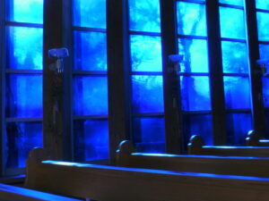 An der Feuerstelle wurden wir von jemandem erwartet, der mit dem Velo zu uns gestossen war. Das Feuer loderte rasch und die Würste waren bald schön dunkelbraun gebraten. Das Mittagessen teilten wir uns gemeinsam. Danach ging es ein kurzes Stück weiter zur Kirche von Ramlinsburg. Wieder einmal konnten wir in das tiefe Meran-Blau dieser ‚Arche‘ eintauchen und vor uns das Kreuz, das allein in einem von Sträuchern und Bäumen umgebenen kahlen Garten steht, auf uns wirken lassen. Wir genossen diesen Moment der Stille.