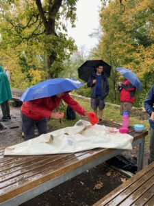 Inzwischen hatte sich der Himmel vollständig bedeckt mit dunklen Wolken. Wir beeilten uns, über das Dorf Wenslingen zur Ruine Ödenburg zu gelangen. Dort begann dann auch der angekündigte Regen. Dennoch konnten wir ein Feuer entfachen, wo eilig unsere Würste (schwarz) gebraten wurden. Daneben erfuhren wir auch von deren aufgrund der kürzlich stattgefundenen Restaurierung revidierten Geschichte: Inzwischen wird aufgrund von neuen Funden angenommen, dass die Herren Homburg oder Thierstein (zwei verwandte Geschlechter aus der Gegend Wittnau / Schupfart) ihr Einflussgebiet nach Westen ausdehnten und dabei im 10. Jahrhundert die Ödenburg gründeten. Die Homburger konnten aber wenig später die Homburg bauen und die Thiersteiner die Besitzungen der Soyhières im Laufental und der Pfeffinger bei Aesch übernehmen, so dass die Ödenburg verlassen wurde und zerfiel. Nach dieser dieses Mal kurzen Mittagspause brachen wir im Regen auf, und wanderten durch den Wald zum Dorfeingang von Wenslingen. Aufgrund der nun rutschigen Verhältnisse auf den Wanderwegen entschlossen wir uns, der Strasse im Aletental zu folgen bis zum alten Wenslingerweg, der direkter Richtung Bahnhof führte. Doch zuerst machten wir einen Abstecher zum Primarschulhaus Tecknau, wo wir Einlass erhielten und die in den 60er Jahren des letzten Jahrhunderts in der Bärenhöhle gefundenen Knochen eines Bären, der vor ca. 30’000 Jahren gelebt hat, anschauen konnten. Nach diesen Eindrücken eilten wir zum Bahnhof, wo wir uns auch schon verabschiedeten.