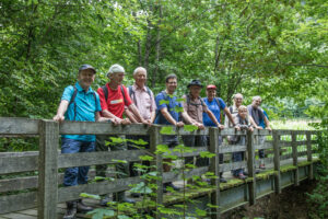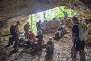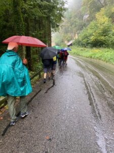 nach einer langen Sommerpause trafen wir uns am 26. August wieder. Dieser Tag wird allen Teilnehmer in Erinnerung bleiben, war es doch eines der äusserst seltenen Male, wo wir im Regen wanderten. Doch beginnen wir von vorne:Wir trafen uns direkt am Bahnhof in Tecknau bei bewölktem Himmel und warmer Temperatur und wanderten am Rand des Eitals hoch. Der Weg ging zuerst im Schatten des Waldes. Vor dem Schützenhaus überquerten wir das Tal zwischen hochgewachsenen Maisstängeln durch. 300m weiter folgten wir dem Eibach wieder zurück zum Wald. Auf diesem Wegstück konnte man die ursprüngliche Nutzung des Baches erahnen, wurde er doch im Winter gestaut, so dass die Wiesen mit fruchtbarem Schlamm überflutet wurden. Nun stiegen wir dem Bach folgend hoch bis an den Fuss des Wasserfalls, wo wir auch einen Blick auf den (verschlossenen) Eingang der Bärenhöhle werfen konnten. Von hier ging es wieder zurück und dann steil hoch zu den Kalkfelsen, wo auch die Bruderlochhöhle sich befindet. Bis hierher hatten wir über die Bedeutung der Grosseltern für ihre Enkelkinder (nach Erikson) erfahren und von einem Beispiel, wie Tradition von einer Generation zur nächsten weitergegeben werden kann (Frage der Kinder zur Bedeutung des Passahmahls mit anschliessender Erzählung der Geschichte vom Auszug des jüdischen Volkes aus Ägypten vor mehr als 3000 Jahren). Zur Geschichte der Bruderlochhöhle ist nichts genaues bekannt. Doch wie beim Bruderholz wird angenommen, dass in der Zeit zwischen dem Niedergang des römischen Reichs und dem Entstehen der karolingischen Reiche sich an verschiedenen Orten Menschen getroffen und zusammen gelebt haben, die ihren christlichen Glauben in einer ursprünglichen Form leben wollten unbeeinflusst von heidnischen Spuren und dem zunehmenden Einfluss der verwaltungsmässig sich gut organisierten ehemaligen christlichen Staatskirche.