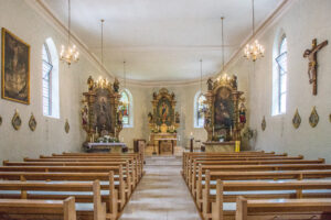 Der Weiterweg führt uns bald zum ehemaligen Kloster ‚Zur Himmelspforte‘, das ursprünglich den Prämonstratenser-Domherren gehörte. Ihr Gründer war ein Wanderprediger, und die Himmelspforte das Ziel eines Christen auf seinem Lebensweg. Hier wurden wir von der Mesmerin empfangen. Sie erzählte uns kurz von der Bedeutung der Kirche als Wallfahrtsort, zeigte uns einig weniger augenfällige Details in der Kirche und führte uns auch in die Sakristei mit wunderbaren Messgewändern. Anschliessend hatten wir in dieser Kirche unseren besinnlichen Moment mit Gesang und Gebet. Im Anschluss folgten wir einem kleinen Betrachtungspfad mit geschnitzten Holzbildern zum Leben von Maria zu einer kleinen Lourdes-Grotte im Wald. Die Bemühungen dieser Kirchgemeinde, einen lokal wichtigen Andachtsort zu erhalten und pflegen, hat uns berührt.