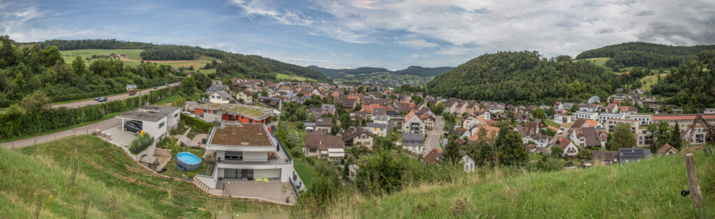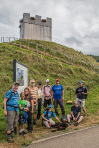 Am 17. August haben wir uns zum dritten Mal dieses Jahr getroffen. Der Start war am üblichen Ort in Sissach. Der Weg führte uns unter der Bahn durch zum Burgerai, dem bewaldeten Hügel Richtung Thürnen. Hier ging es in grossen Kehren hoch bis zum höchsten Punkt, der Chärneweid. Etwas versteckt im Wald sind dort Mauerreste, die eine alte, lange Zeit genutzte Wehranlage umgaben. Hieher haben sich, wahrscheinlich schon bevor die Geschichtsschreibung begonnen hatte, Menschen auf dieser Talseite von Sissach geflüchtet, wenn kriegerische oder brandschatzende Horden ihre Siedlungen bedrohten. Auf der Sissacherfluh ist für die andere Talseite ein gleicher Ort erkennbar. Schon bald waren wir vor dem Wölflistein an einer Feuerstelle angelangt, die für unsere Teilete günstig war. Zuerst hiess es Holz zu sammeln und klein zu machen. Schon bald roch es bald nach unterschiedlichen Würsten. Nach dieser Mittagsrast wanderten wir weiter zum Hof Oberer Wölflistein, der von einer Anlage mit Hochstammbäumen umgeben ist. Auf dem Weg am Waldrand fanden wir reife, von der Sonne gewärmte Brombeeren, die regen Zuspruch fanden. Schon ging es wieder bergab an den Bauernhöfen Hinter Horn vorüber und steil hinunter nach Zunzgen hinter das ehemalige Bemag-Areal. Dieses durchquerten wir, um einen alten Dorfteil um die ehemalige Mühle zu erreichen. Diese steht nicht mehr, nur noch ein Nebengebäude, bei dem eine alte bemalte Stubendecke gefunden worden war. Ein Bewohner des Nebenhauses ermöglichte uns den Zugang zu diesem Ort. Von den Farben ist leider zur Zeit nicht mehr viel zu erkennen. Der Weg führte uns weiter zum neuen Gemeindehaus und dann hoch zum Büchel. Inzwischen weiss man aus Sondiergrabungen, dass dieser ein künstlich aufgeschichteter Hügel ist, auf dem wahrscheinlich einmal eine sogenannte Motte stand, eine steil zugängliche Holzfestung, wohin die Bewohner der umliegenden kleinen Siedlung wiederum beim Anmarsch brandschatzender Horden nun im 10.-12. Jahrhundert fliehen konnten. Zur 700 Jahr-Feier von Zunzgen wurde eine neue Motte auf dem Hügel errichtet, die wir besteigen konnten. Die Aussicht ist grossartig (siehe Panorama-Foto unten)! Es lohnt sich, dorthin zu gehen (Eine Besichtigung muss vorgängig auf der Gemeindeverwaltung angemeldet werden.)