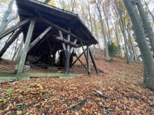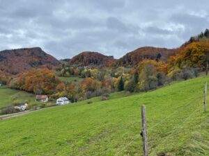 Am Samstag, 25. Oktober, waren wir zu dritt unterwegs auf unserer Wanderung. Viele hatte achtsame Gründe, dass sie nicht dabei sein konnten, inklusive wegen dem Wetter. Ja, ab Mittag regnete es, wir wurden nass und froren deswegen. Hey, Männer, ihr habt doch verpasst, zu sehen und erleben, was wir erfuhren: Unterhalb des Chienbergs begegneten wir einer Gämse im schwarzen Winterfell in 20-30m Distanz. Und nachdem wir die Umlenkstation der Gipsbahn uns genau angeschaut hatten, sahen wir sie erneut. In der Gipsgrube leuchteten die nassen Gips-haltigen Steine im Kalkfelsen so hell und weiss, wie sonst nie. Und auf einer Wiese sprangen plötzlich 2 grosse Rehe, wahrscheinlich Böcke, die ihr Geweih bereits abgestossen hatten und ebenfalls das Winterfell trugen, elegant und kraftvoll in grossen Sätzen an uns vorüber in den nahen Wald und verschwanden dort. Und das Mittagessen haben wir trocken, geschützt unter dem Vordach der Skihütte von Zeglingen eingenommen. Die Sitzbank war für uns drei gerade gross genug. Und wir haben drei unterschiedliche Kalkregionen durchquert. Sogar wir als Laien konnten die Unterschiede der Steine erkennen: hell, glatt, geschichtet – bräunlich, ohne innere Ordnung, ‚en bloc‘ – grau, raue Oberfläche mit harten Punkten von Korallen- und Muschelresten.